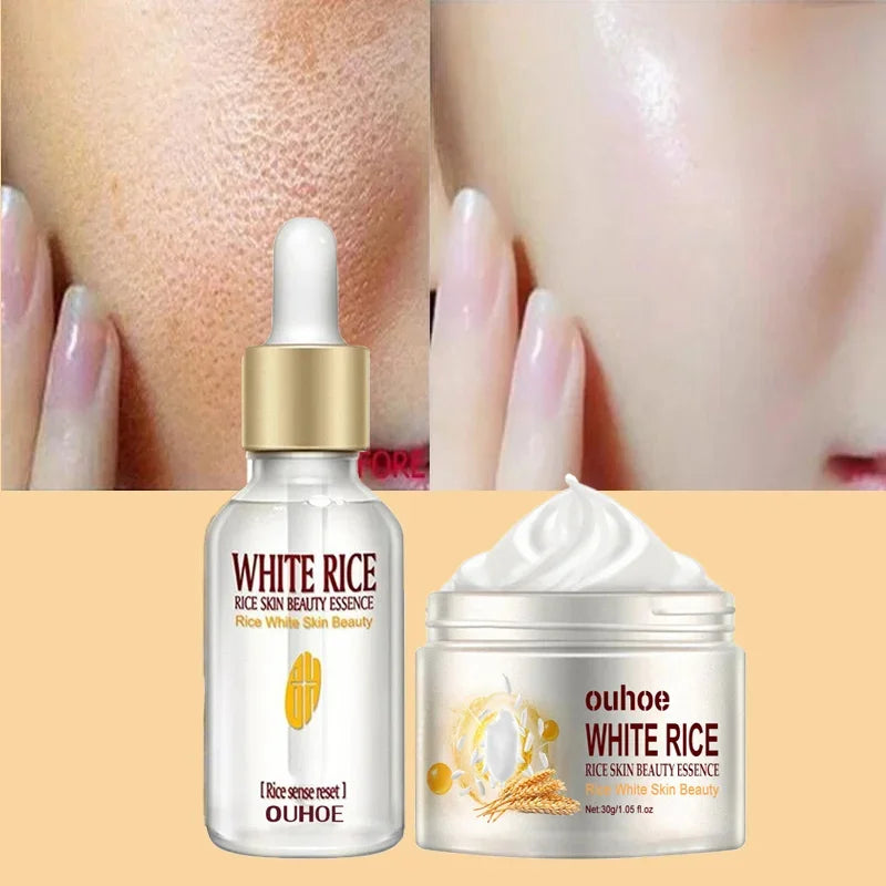 The White Rice Whitening Face Serum is an advanced skincare solution designed to reduce wrinkles, fade fine lines, and shrink pores for smoother, brighter skin. Enriched with natural rice extracts, this serum deeply moisturizes and rejuvenates the skin, promoting a youthful and radiant complexion. Perfect for all skin types, it provides a refreshing touch of nourishment for a glowing, healthy appearance.