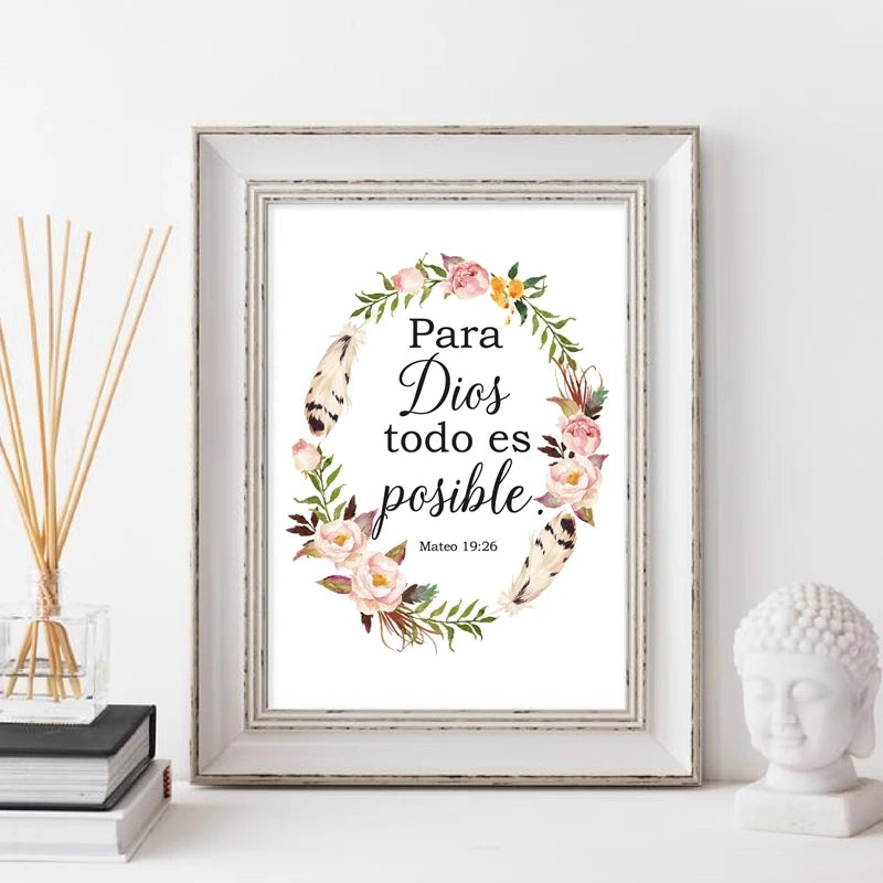Inspirera ditt hem med dessa vackra spanska bibelverscitat! Med upplyftande budskap och blommönster, ger denna kristna väggkonst en touch av tro och skönhet till ditt utrymme. Perfekt för heminredning, varje del fungerar som en påminnelse om Guds oändliga kraft och kärlek. Ett meningsfullt tillskott till alla rum.